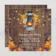 Invitations rustiques de la fête de l'engagement de pays avec un arrière - plan de grange en bois, feuilles d'automne, une lanterne éclairée aux bougies, des lampes à corde et un modèle mariage moderne.