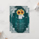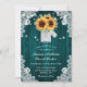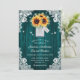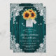 Invitations de mariage turquoises rustiques avec un bouquet de tournesol à l'intérieur d'un bocal de maçon contre un arrière - plan turquoise en bois de grange orné de dentelle blanche fleurie et de lampes à cordes. Un design de carte parfait pour inviter vos invités à votre mariage turquoise rustique inspiré des tournesols. Conception entièrement personnalisable. Éléments correspondants disponibles.