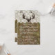 Rencontre de mariage rustique avec un arrière - plan de chasse au camouflage avec des bois de cerfs montés sur des dentelles imprimées, ce qui lui donne un air élégant d'une invitation rustique à la camo pour les chasseurs Le côté arrière a le même arrière - plan de camouflage, avec les bois et la dentelle.  Il a aussi les noms des mariés et des mariés sur une bande blanche de superposition.   La dentelle n'est qu'un dessin imprimé, pas un vrai tissu de dentelle.   Ces invitations aux mariages de camo de chasse sont parfaites pour quiconque aime le pays, la chasse, le camouflage, ou qui a un mariage campagnard extérieur.