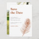 Design minimal Mariage Sauvegarder la date Invitation présente une illustration élégante de ligne de plumes paon avec un thème couleur terre cuite rouille. Design typographique moderne et propre, cette invitation de mariage est prête pour vous à customiser avec les détails de votre journée spéciale. Fait partie d'une gamme toujours croissante de papeterie.