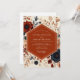 This design features a warm, autumnal palette with rich rust tones and deep navy blue accents. Intricate floral illustrations and botanical elements create a romantic and rustic atmosphere, perfect for a harvest-themed celebration. The artwork evokes a sense of natural beauty and vintage charm.