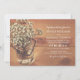 Un faire-part de mariage rustique avec l'image d'un pot en maçon plein de fleurs d'haleine blanche pour bébé sur un arrière - plan en bois.