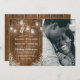Invitations de mariage chic à la campagne avec un arrière - plan en bois de grange rustique, des lampes à mâchoires à cordes, un décor d'angle fleuri respirant pour les bébés, un tag attaché avec un noeud portant vos initiales, une photo de la future mariée et mariée, et un modèle mariage simple, facile à personnaliser.