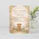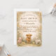 A charming countryside design featuring a fluffy calf, a sweet little lamb, and tiny yellow chicks nestled among soft meadow wildflowers. The warm parchment background and muted earth tones create a cozy, rustic atmosphere with a gentle storybook feel. Delicate greenery frames the layout while the farm animal illustration adds warmth and personality. Perfect for a neutral rural-themed celebration with classic farmhouse charm.