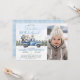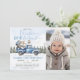 Cute winter onederland themed first birthday invitation with a photo featuring a blue truck and pine-tree forest and woodland animals.