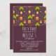 Une invitation rustique à l'anniversaire de camping avec un motif amusant thème camping. Placer sur un arrière - plan brun rougeâtre. Les éléments du motif comprennent un feu de camp, une tente, une guitare, une pelle et un sac à dos.