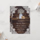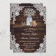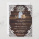 Faire-part de mariage rustique à fleurs de campagne avec souffle de bébé à l'intérieur d'un bocal de maçon et d'une mignonne boîte à anneau mariage avec initiales sur un arrière - plan rustique en bois orné de dentelle blanche fleurie et de lampes à cordes. Deux coeurs de burlap à l'arrière. Un design de carte parfait pour inviter vos invités dans votre pays rustique, ou la fête de mariage de grange inspirée par le souffle de bébé.