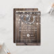Invitations de mariage chic et rustique avec un arrière - plan de grange en bois, une paire de fer à cheval, des lampes à corde et un modèle mariage moderne.