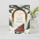 Invite friends and family to a cozy winter celebration with this rustic mountain Christmas party invitation. A classic red vintage pickup carrying a fresh evergreen drives through a snow-covered alpine village, framed by an elegant antique gold arch. The layout includes easy-to-edit fields for your party date, time, location, and RSVP.