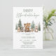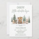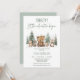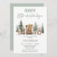 Sweet let the adventure begin baby shower invitation featuring some woodland animals in a winter forest setting with pine trees.