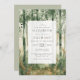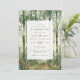 Un paysage rustique de forêt aquarelle dans les tons vert et or fournit l'arrière - plan pour le texte gris fusain sur un écran blanc rectangulaire. L'envers offre de l'espace pour les détails mariages sur un arrière - plan vert solide, ainsi qu'un code QR que les clients peuvent scanner pour visiter votre site Web et RSVP, ce qui permet d'économiser le coût d'impression et d'envoi de cartes RSVP séparées.