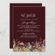 This rustic meadow botanical we still do vow renewal invitation is perfect for a modern vow renewal ceremony and celebration. The design features seamless hand-painted yellow, navy, blue, yellow, pink, and blush wildflowers with botanical leaves in a deep burgundy background.