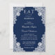 Complétez votre fête de mariage rustique bleu marine avec ces invitations de mariage élégantes et romantiques avec dentelle florale blanche sur un arrière - plan bleu marine.