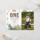 Cette amusante invitation rustique a un lambris "ONE" et un joyeux camper. Le fond a une forêt aquarelle, des montagnes et des paysages. Il est terminé par les articles de camping bronzés, verts et bruns qui comprennent une tente et une cheminée. Le dos a un motif de la même tente aquarelle.