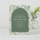 Celebrate your special day with this elegant sage green wedding invitation featuring a modern arch design surrounded by soft watercolor greenery. The front showcases your wedding details in clean, classic typography set against a deep sage panel, creating a beautiful contrast with the leafy botanical background.