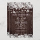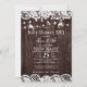 Rustic country couple baby shower backyard barbecue invitation on dark brown barn wood featuring bold typography, white flowers, lace borders, and strings of twinkle lights. +++++++++++++++ The invitation is suitable for summer autumn fall outdoor garden backyard rustic country bbq new baby shower, or sprinkle parties.