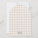 This wedding invitation features Destei's beige gingham background paired with a watercolor illustration of two hares facing one another with a small brown heart and three carrots placed between them. A rounded white arch with a brown border frames the design and creates a clear space for your wedding details.