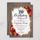 Rustique Invitation du 20e anniversaire. Design élégant avec parties scintillant en or et motif en bois brun foncé. Parfums de tournesol et rose. Idéal pour un élégant style champêtre ou une fête d'anniversaire dans le jardin.