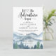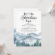 Elégante aquarelle rustique montagnes et la scène de la forêt, avec des arbres bleus et verts luxuriants et des montagnes avec un texte écrit : laissez l'aventure commencer. Pour ceux qui aiment une ambiance de rêve romantique boisée pour leur cérémonie et célébration. Vous pouvez conserver vos noms et votre date au dos de l'invitation ou les supprimer.