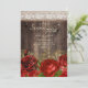 Invitation de fête surprise pour les 70 ans pour les femmes avec du bois brun foncé rustique et des fleurs rouges et or sur toile de jute avec de la dentelle blanche élégante. Contactez-nous pour obtenir de l'aide pour la personnalisation ou pour demander des produits assortis.
