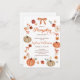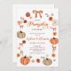 Célébrez votre petit citrouille sur le chemin avec cette adorable invitation baby shower pour une fille. Le design se compose d'un arrangement charmant de citrouilles en orange tendre et orange brûlé, accentué de plusieurs arcs sucrés pour une coquette et un look boho automne. Une invitation saisonnière parfaite pour accueillir votre petite fille.