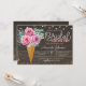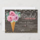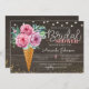 Invitation à la douche nuptiale avec cône de crème glacée rempli de bouquet de fleurs roses rousses et de feuilles verdoyants, et points de parties scintillant rose.