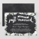 Cette élégante et moderne invitation pour le 30e anniversaire de mariage comporte une belle calligraphie à l'encre, de magnifiques fleurs bleues et blanches, une typographie qui indique "Juste mariés (il y a trente ans !)", et un fond rustique de tableau noir.