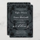 Fonte pivotée calligraphie blanche lustrée lettrage à la main contre un arrière - plan gris victorien profond avec acanthus noir tourbillonne damas soulignant ce faire-part de mariage rustique vintage.
