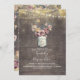 Vintage invitation au baby shower rustique présente mauve et doré bocal de mason floral, chaîne de lumières, et vieil arrière - plan en bois de grange.