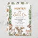 Rustic Moose Woodland Wild One 1st Birthday Invitation Jolie invitation d'anniversaire pour les garçons à thème boisé avec un orignal, loup, renard, raton laveur et porc-épic. Cette invitation à un 1er anniversaire de forêt sauvage comprend également quelques pins et un paysage boisé.