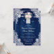 Faire-part de mariage rustique bleu marine et floral roux avec un bouquet de roses blush et des fleurs d'haleine de bébé à l'intérieur d'un bocal de maçon contre un arrière - plan en bois de grange orné de dentelle fleurie blanche et de lampes à cordes. Un design de carte parfait pour inviter vos invités à votre fête de mariage campagnard bleu marine et rustique. Personnalisez facilement cette invitation de mariage avec vos détails mariages en ligne. Conception entièrement personnalisable. Éléments correspondants disponibles.