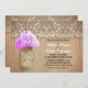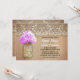 Joli faire-part de mariage rustique avec bocal de mason avec fleur d'hydrangée violet clair. Invitation parfait pour le mariage campagnard avec dentelle vintage et des accents en bois.
