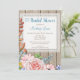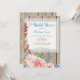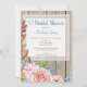 Une charmante invitation à la douche nuptiale rustique avec un joli bouquet rose sur un arrière - plan en bois avec cadre en dentelle blanche. Parfait pour un thème de la douche nuptiale de campagne.