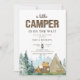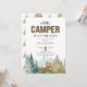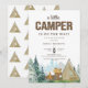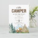 Cette amusante invitation rustique a un panneau en bois "CAMPER" et une police de script. Le fond a une forêt aquarelle, des montagnes et des paysages. Il est terminé par les articles de camping bronzés, verts et bruns qui comprennent une tente et un feu. Le dos a un motif de la même tente aquarelle.