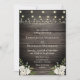 Invitation vos invités à la ferme mariage de vos rêves. Vieux, arrière - plan en bois de barbier foncé avec des lumières suspendues contrastées au-dessus, et d'anciens bouquets fleuris blancs en bas à gauche et à droite.
