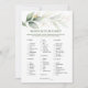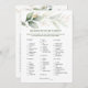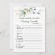 Cette conception présente une illustration aquarelle de feuillage vert et or avec des confettis à effet doré. Jeux de Baby Shower de verdure - Carte recto-verso - Deux jeux en un ! Le jeu "Qu'y a-t-il dans votre sac" pour l'enterrement de vie de jeune fille sur le devant de la carte et le jeu de désordre de mariage au verso. Le corrigé du jeu de désordre de mariage : Mariée, Marié, Gâteau de mariage, Lune de miel, Amour vrai, Robe blanche, Dentelle, Bonheur, Bougie d'unité, Demoiselle d'honneur, Garçons d'honneur, Officiant, Chapelle, Vœux de mariage, Porte-alliance.