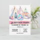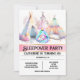Une belle aquarelle graphique en ai avec trois tentes en 3D réalistes d'imaginaire inspirées des teepee dans les tons pastel rose, bleu, orange et blanc qui ont des petites lumières féeriques scintillantes sur eux. Une petite licorne mythique est enroulée dans un sac de couchage bleu pâle et dort à poings fermés. Ces adorables illustrations sont dressées contre un arrière - plan blanc qui les rend pop. Personnalisez les modèles de texte noir modifiables selon vos besoins. Elles sont idéales pour votre fille si elle a un "thème de la licorne" ou un sommeil glamour / fête du sommeil pour les amis pour célébrer son anniversaire.