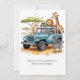 Un clipart d'aquarelle illustration d'une Jeep bleu ciel joyeuse garée sur une dune de sable. La Jeep a un porte-toit blanc avec trois animaux de safari fantaisistes, une girafe souriante, un zèbre curieux et un lion ludique, perché sur le dessus. L'arrière - plan présente des dunes de sable roulantes sous un ciel lumineux et ensoleillé, avec des nuages blancs et des palmiers éloignés. Des ombres douces coulent à travers la scène, créant une sensation de légèreté et d'aventure.