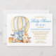 Elégant Aquarelle moderne Baby Animals Hot Air Balloon Baby shower par Mail Invitation. Les bébés animaux comprennent Elephant avec Bleu Bow, Singe, Girafe, Rhino, Zèbre et Lion. Gold et Blue Script.