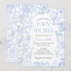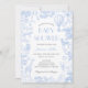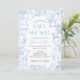 Elégant Blue Toile de Jouy Floral Baby shower Invitation, avec un charmant thème animal safari. Cette invitation magnifiquement conçue présente une montgolfière ainsi que d'adorables animaux de safari comme une girafe, un éléphant, un zèbre et un lion, le tout face à un arrière - plan de chinoiserie à fleurs bleues. Avec son esthétique vintage et sa typographie gracieuse, cette invitation donne le ton d'une célébration intemporelle. Entièrement personnalisable pour correspondre aux détails de votre événement, c'est le choix idéal pour un baby shower à thème safari pour garçon, alliant charme et sophistication.