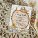Cette invitation unique au baby shower de saumons boho présente un mélange d'accents rustiques vintages dans des tons chauds comme le beige, le faon et le marron. Les animaux adorables de la jungle, dont un lion, un singe, un tigre, un zèbre, un rhinocéros, un éléphant et une girafe, apportent une touche ludique. Les élégantes herbes de pampas et les feuilles de palmiers complètent l'arrière - plan en tranche de bois, créant une atmosphère confortable et accueillante.