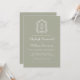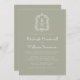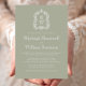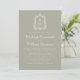 Cet élégant design de faire-part de mariage d'inspiration vintage comprend une paire d'initiales en monogramme blanc en police serif ouverte au-dessus et au-dessous d'une ligne de séparation et entourée d'une crête acanthus d'art sur un arrière - plan vert sage. Le dos de la carte est vert sauge solide.