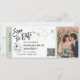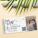 Destination Beach Wedding Boarding Pass Billet Gold Plane Enregistrez la Date avec l'icône du coeur et de l'avion avec une ligne minimaliste simple carte du monde et couleur arrière - plan vert sage. Ajouter votre code QR