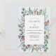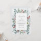 Lush sprigs of eucalyptus and pine needles create a vibrant seasonal backdrop for delicate white hellebore flowers. Vibrant red berries provide a striking contrast against the soft sage green and muted emerald foliage. This design captures a romantic winter atmosphere through a detailed watercolor botanical arrangement.