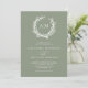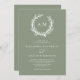 Parfait pour les mariages de plage et nautiques, une couronne de corail encadre les monogrammes de la mariée et du marié en haut de cette élégante invitation verte de sauge verte côtière avec texte blanc.