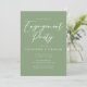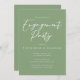 Cette simple invitation à la fête de fiançailles verte à la sauge solide présente une élégante typographie blanche pour une cérémonie en plein air dans un cadre naturel. Script minimaliste sur un invitation vert clair paisible pour un lieu rustique en dehors d'une forêt d'arbres.