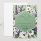 Evoke the charm of a sunlit meadow with this elegant botanical design. A serene sage green background sets the stage for delicate sprigs of purple lavender and lovely white anemones. Wispy green leaves and smaller blossoms create a lush, natural atmosphere. This artful arrangement is perfect for a romantic, nature-inspired spring or summer union.