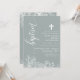 Célébrez l'occasion sacrée d'un baptême avec cette invitation élégante à l'écriture calligraphiée dans les tons de sauge poussiéreuse et de floral blanc. Caractérisée par des motifs floraux blancs complexes sur un fond de sauge doux, cette invitation est parfaite pour inviter amis et famille à se joindre à cet événement spécial. Les éléments floraux élégants ajoutent une touche de beauté naturelle et de grâce, ce qui la rend idéale pour une célébration aussi significative. Personnalisez les détails pour créer une invitation unique et mémorable pour le baptême de votre enfant.