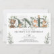 Cette élégante invitation d'anniversaire de 1 an présente une douce verdure aquarelle, des animaux de forêt adorables et des lettrages modernes. Convient aux garçons et aux filles !