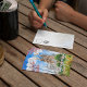 Cette carte postale présente un portrait aquarelle de la Sagrada Familia à Barcelone, en Espagne.